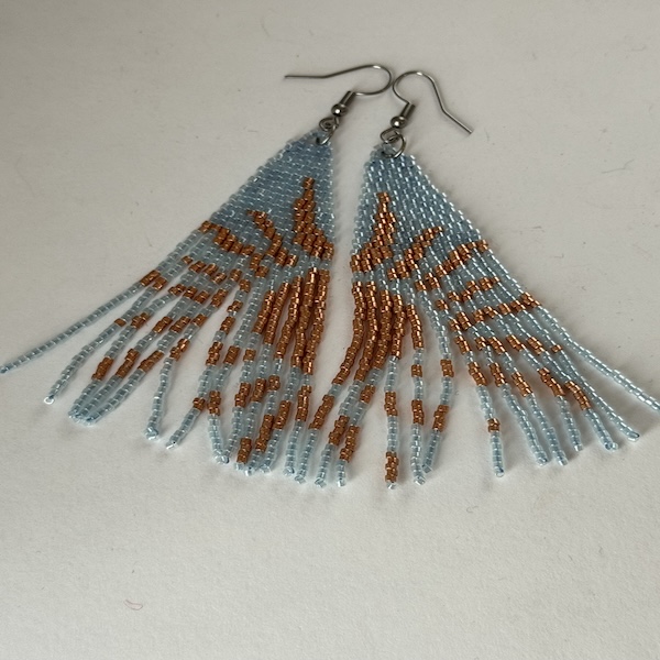 “Dawn” is a whisper of morning stitched in bead and breeze. Pale sky-blue strands fan out into a soft triangular fringe, threaded with glints of warm copper that slice like first light across the horizon. Each delicate tassel trembles with motion, scattering tiny sunbeams as you move. Airy, luminous, and quietly hopeful—these earrings feel like wearing the instant the world exhales and the day begins.