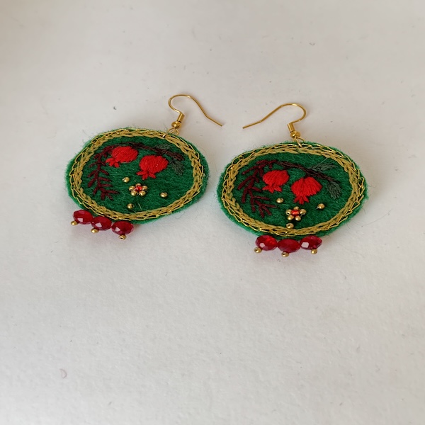 Joy Whisper” whispers like a small, private celebration stitched into soft felt medallions. Twin blossoms nestle among looping tendrils and tiny seed-like beads, all bordered by a braided rim. A trio of dangling beads punctuates each piece like a soft chime. The result is an intimate, hand-stitched talisman of good cheer—subtle, tactile, and quietly jubilant.