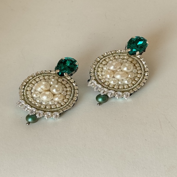 Pearl Rosette” is a little ceremonial bloom—an emerald teardrop crowns a concentric halo of glittering crystals that embrace a cluster of soft, baroque pearls. The pearls pool like moonlit raindrops at the center, framed by precise pavé rings and finished with a single muted-green pearl that swings like a last petal. Timeless and refined, these earrings feel like heirloom elegance given a modern, feminine pulse.